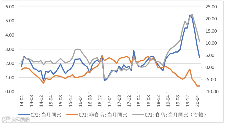 CPI方面,近期受进口受阻,饲料价格坚挺,南方多地出现持续降雨和洪涝,北京新发地市场关闭等多重因素影响,猪肉和蔬菜等食品价格环比明显回升。但生猪供给端已处于趋势性改善之中:截至5月能繁母猪存栏已连续8个月环比正增长,生猪存栏已连续4个月环比正增长,猪肉价格继续大幅上涨的可能性不大,三季度猪肉均价虽仍会高于去年同期水平,但同比涨幅应当会明显低于二季度。三季度南方多地的降雨和洪涝可能持续,蔬菜价格有一定上涨压力。因此综合来看,预计三季度CPI中枢可能在二季度2.7%的基础上微幅变化。