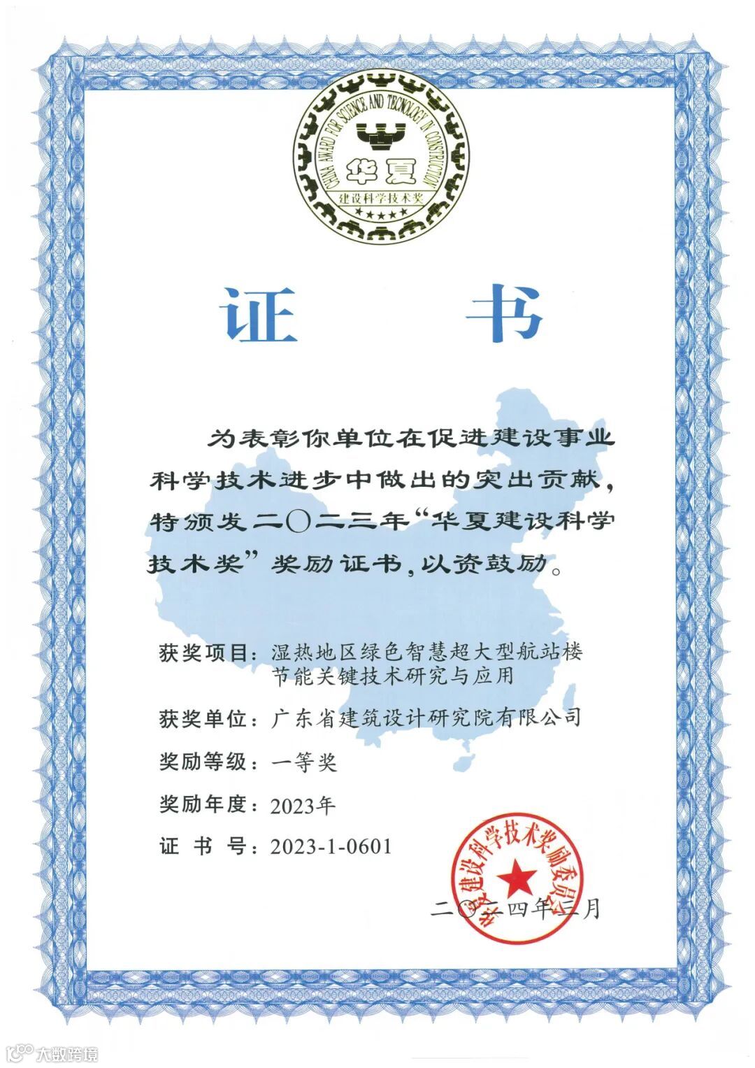 此前,省建院也成功斩获2023年度华夏建设科学技术奖一等奖2项、二等奖1项、三等奖1项。其中,《湿热地区绿色智慧超大型航站楼节能关键技术研究与应用》是省建院作为牵头单位所荣获的首个华夏奖一等奖科研项目。