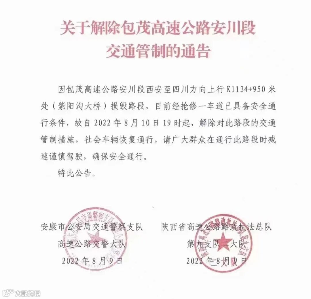 故自2022年8月10日19时起,解除对此路段的交通管制措施,社会车辆恢复通行