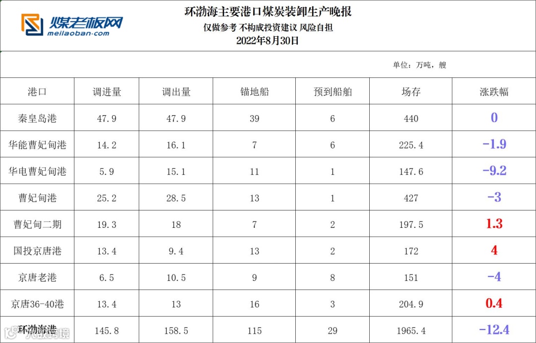 环渤海主要港口煤炭装卸生产晚报