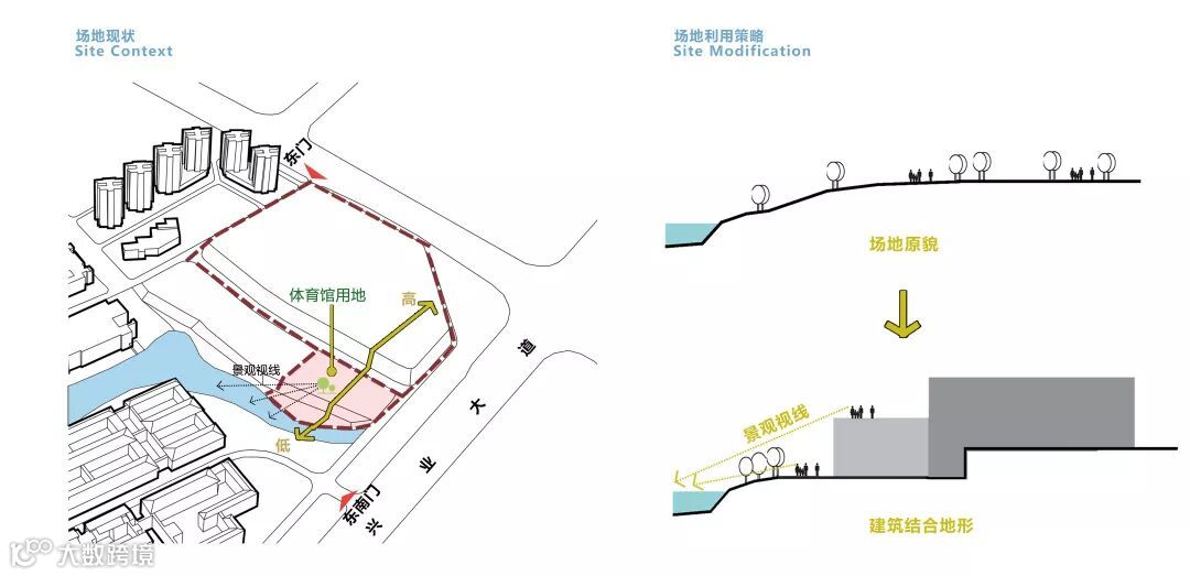 项目用地西面贴临镜湖,东、南面为校园内部道路,用地现状与道路、湖面均存在较大高差。设计利用场地地形和景观资源,通过自然地势形成退台,营造观湖亲水活动平台;地形最大化的利用,最大可能地减少土方工程,同时强化了体育馆与镜湖的互动,形成多层次、开放式的建筑空间和景观空间。