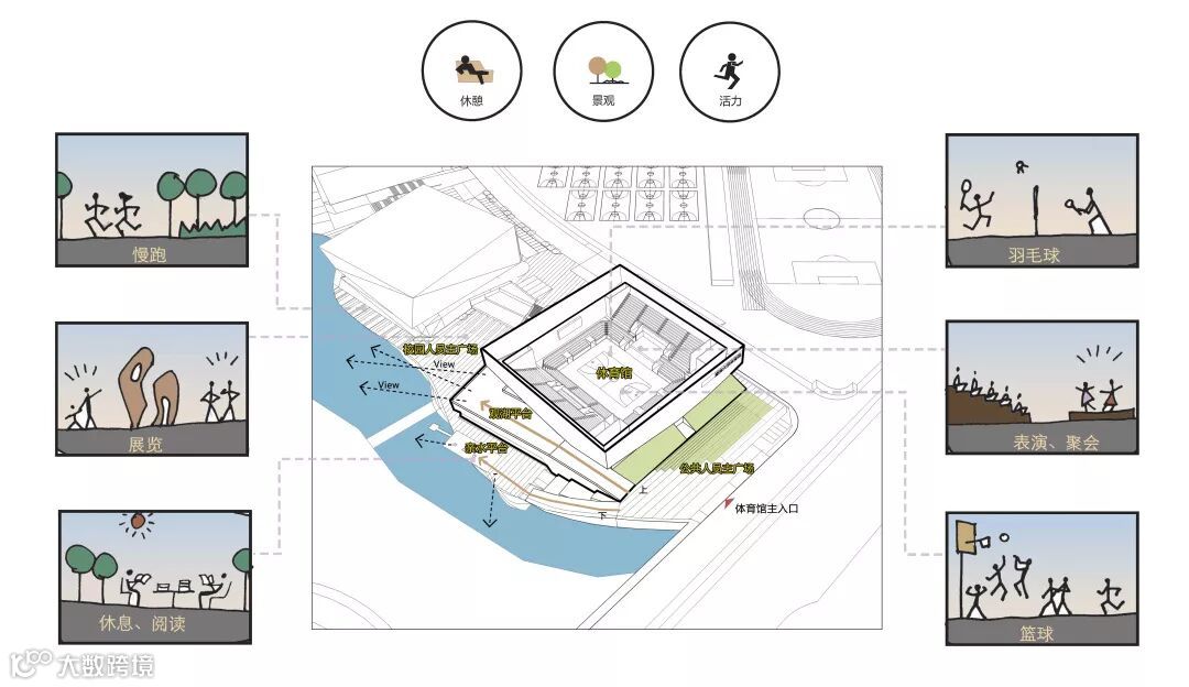 (2)跌级式观湖活力平台,为学校师生提供一个开放式的可供交流、休憩、展览的互动空间;