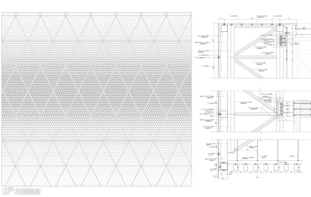 结合室内空间对采光要求的不同,教师办公用房以及走道等对采光需求较高的用房,外立面穿孔铝板的透光率会相应增大,参数化的模拟放样通过等边三角形标准单元模块进行组合与排列,实现穿孔铝板幕墙的渐变效果。这一方法使铝板的加工定制效率大为提高,节省工程造价,也降低了施工难度。