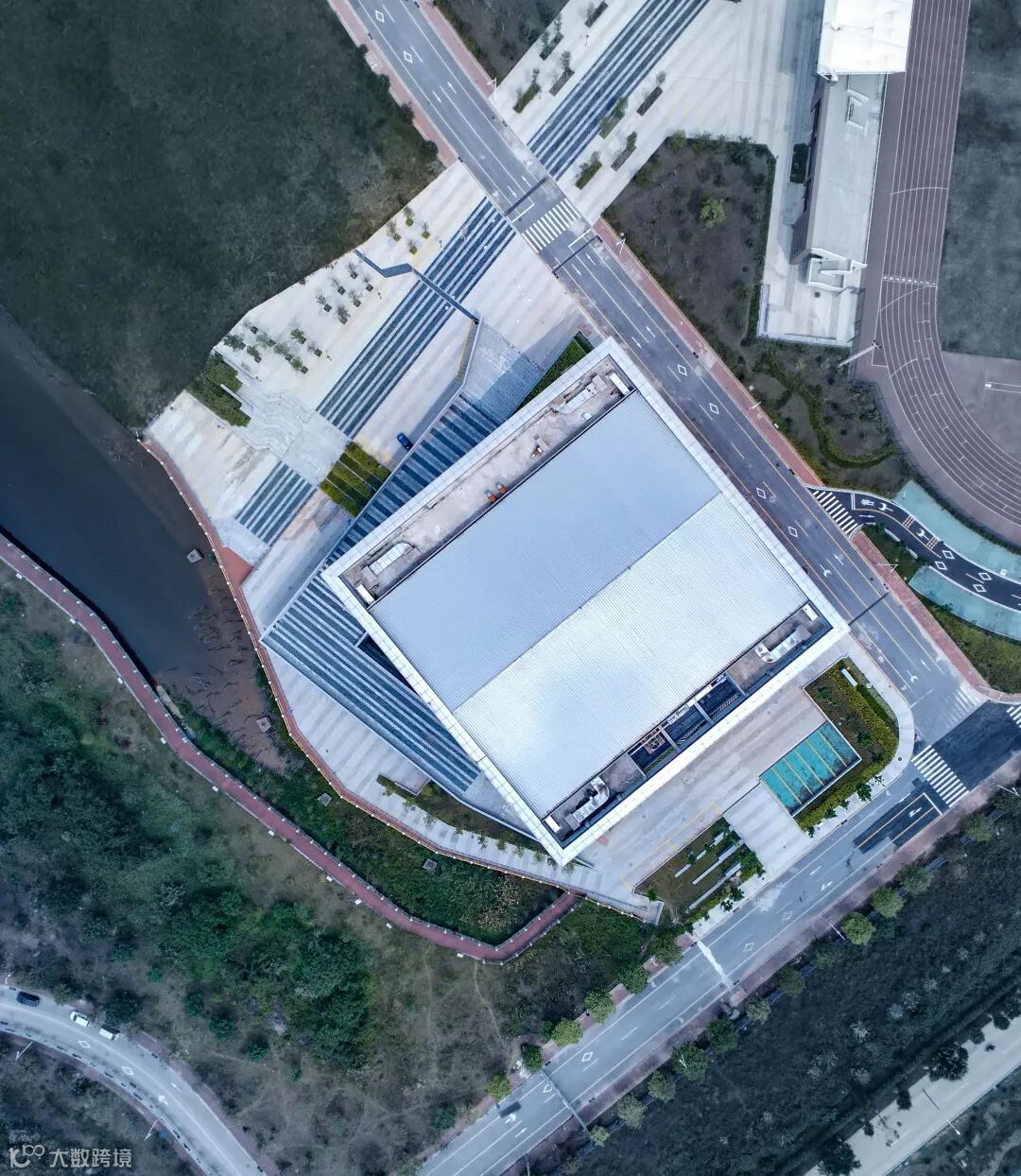 建筑布局通过上下两个方形体块相互扭转,使建筑整体与湖岸以及城市道路都有良好的互动。