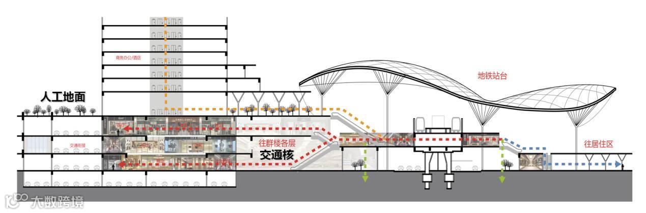 以轨道交通为基础,构筑公交、私家车、共享单车等多式联运的大容量枢纽综合体,以紧凑的交通核串联“轨道站-多首层上盖-城市片区”,形成连续、便捷、安全的步行路径,实现全天候的零换乘立体人车分流出行体验,构筑安全的、便捷的、高效的城市慢行街区。