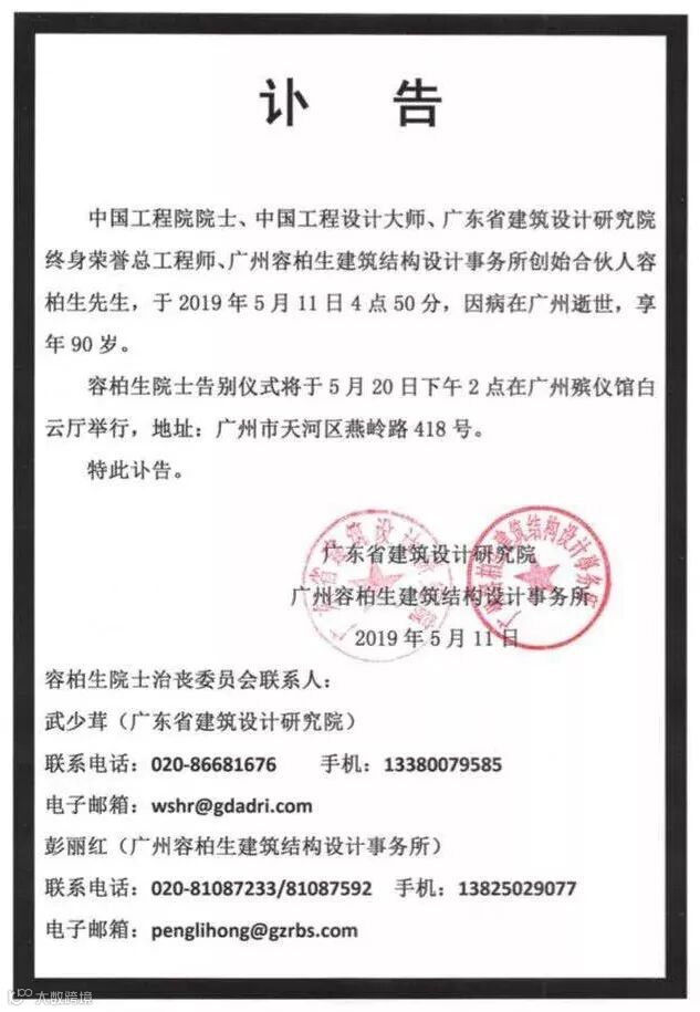 中国工程院院士、中国工程设计大师、广东省建筑设计研究院终身荣誉总工程师、广州容柏生建筑结构设计事务所创始合伙人容柏生先生,于2019年5月11日4点50分,因病在广州逝世,享年90岁。