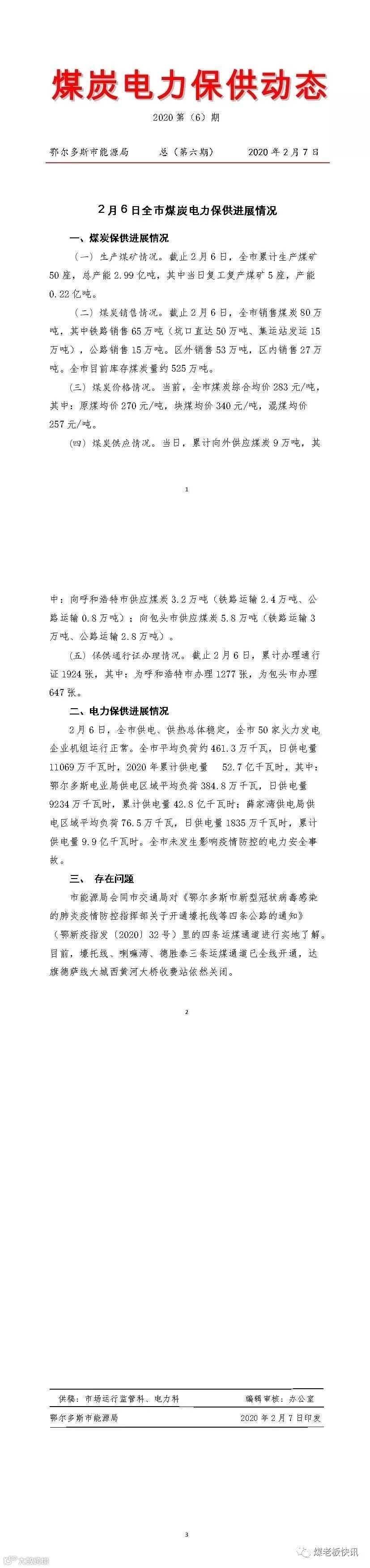 截止2月6日,内蒙古鄂尔多斯市累计生产煤矿50座,总产能2.99亿吨,全市销售煤炭80万吨,主要以铁路销售为主,销售量为65万吨。