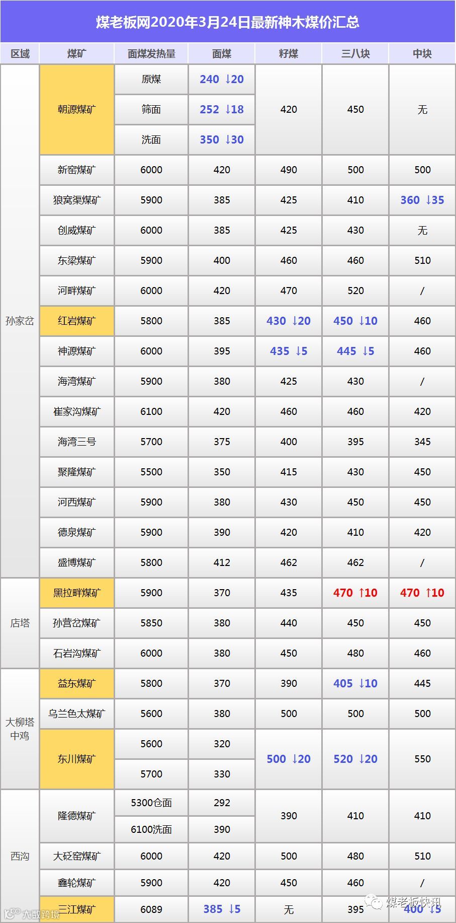 最新调价煤矿:昨日主产地神木地区煤价整体承压下行为主。黑拉畔煤矿块煤上涨10元/吨,最新调价煤矿如下表。