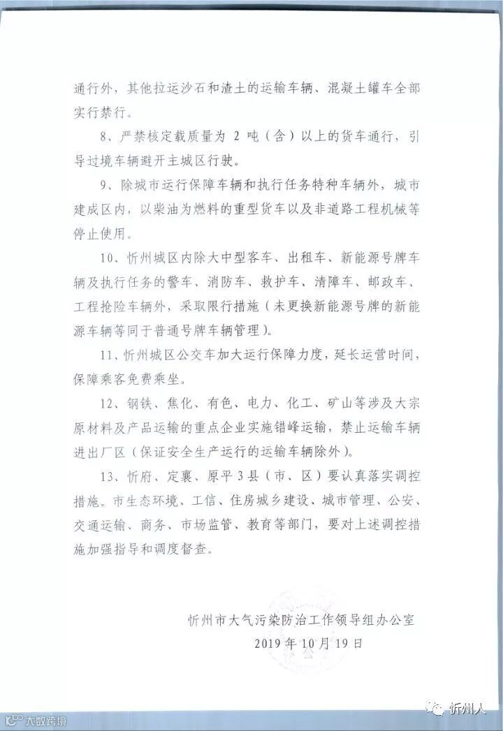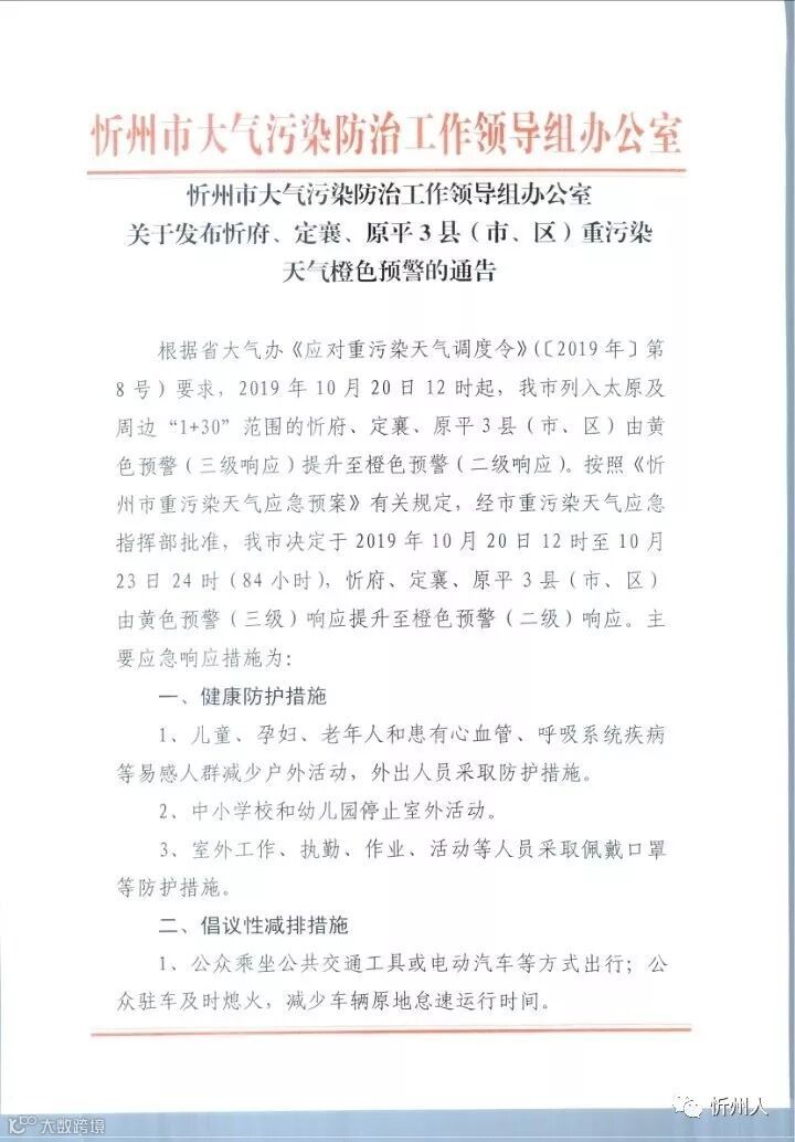 根据省大气办《应对重污染天气调度令》(〔2019年〕第8号)要求,2019年10月20日12时起,我市列入太原及周边“1+30”范围的忻府、定襄、原平3县(市、区)由黄色预警(三级响应)提升至橙色预警(二级响应)。按照《忻州市重污染天气应急预案》有关规定,经市重污染天气应急指挥部批准,我市决定于2019年10月20日12时至10月23日24时(84小时),忻府、定襄、原平3县(市、区)由黄色预警(三级)响应提升至橙色预警(二级)响应。现将有关限行通告如下: