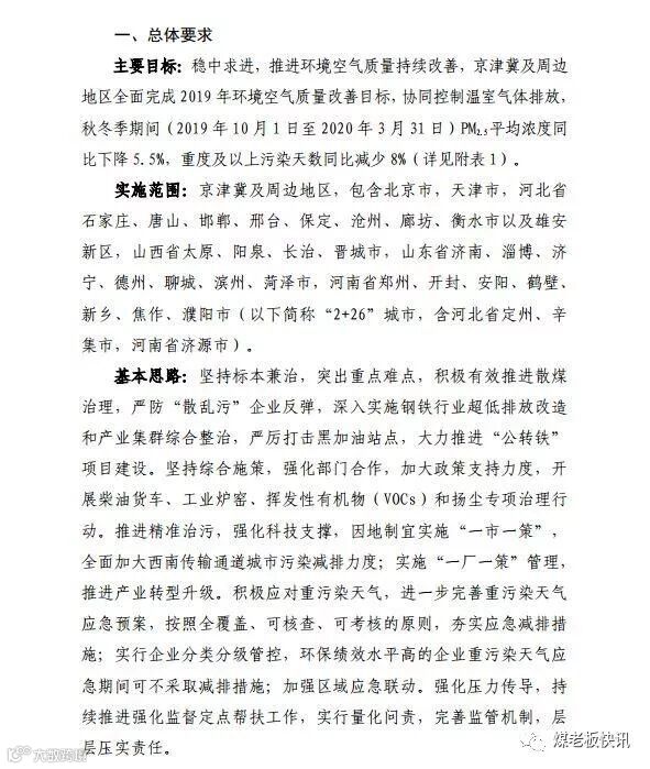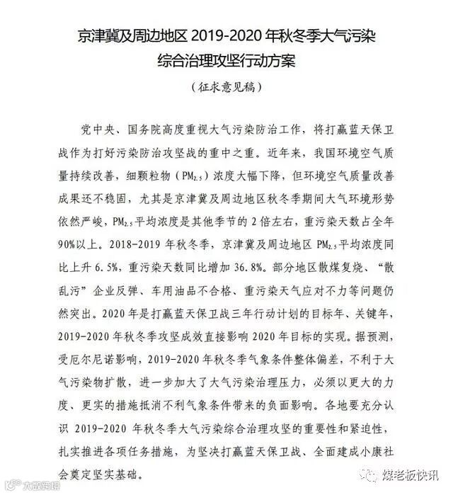近日,生态环境部发布了《京津冀及周边地区2019-2020 年秋冬季大气污染综合治理攻坚行动方案(征求意见稿)》(以下简称“意见稿”),也就是大家所说的“停工令”。意见稿称,2020 年是打赢蓝天保卫战三年行动计划的目标年、关键年,2019-2020 年秋冬季攻坚成效直接影响 2020 年目标的实现。据预测,2019-2020 年秋冬季气象条件整体偏差,不利于大气污染物扩散,进一步加大了大气污染治理压力,必须以更大的力度、更实的措施抵消不利气象条件带来的负面影响。