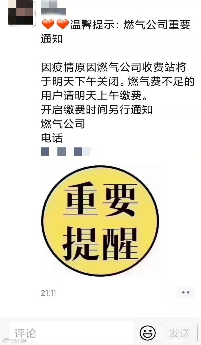 近期,部分人的微信朋友圈流传着“燃气公司收费站因疫情原因将于明天下午关闭”,见下图: