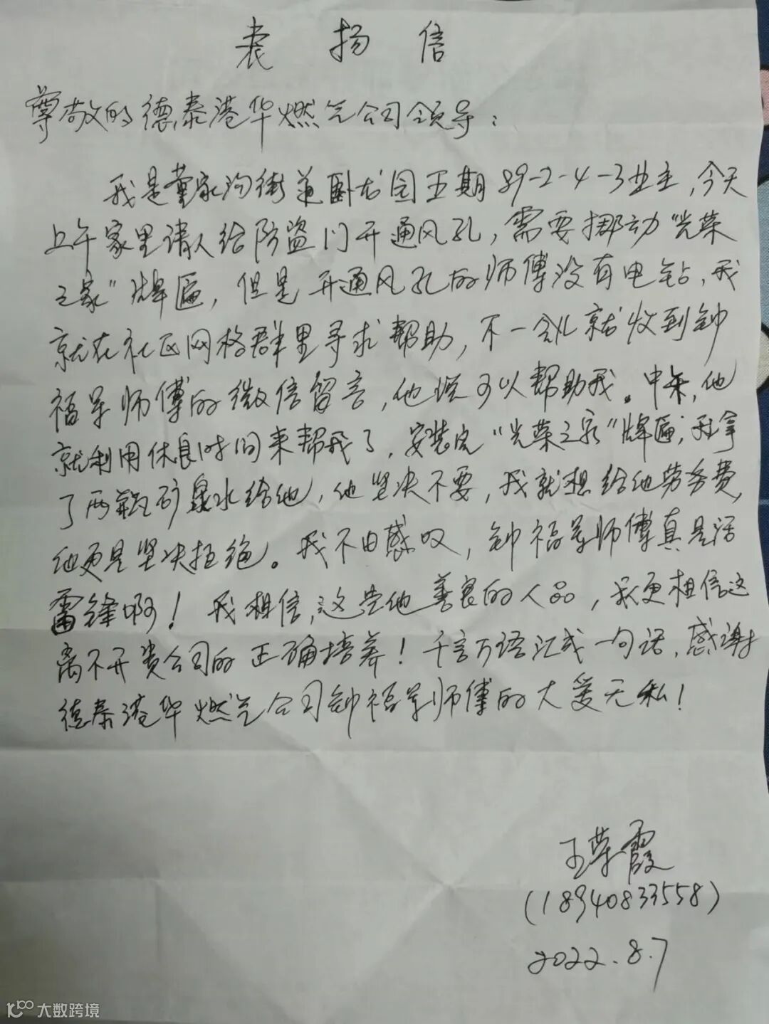 王女士随后送来表扬信并表示:钟福军师傅真是乐于助人的活雷锋!感谢师傅的大爱无私,相信这是他善良的人品,更相信这离不开燃气公司正确的培养!“燃气服务,不止于燃气”体现了燃气服务人员的赤诚。