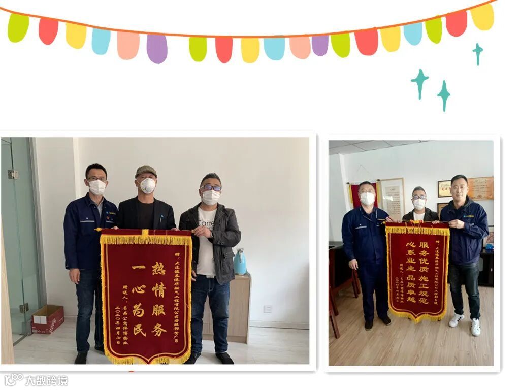 4月7日,大连开发区名品公寓伟博物业负责人将写有“热情服务,一心为民”、“服务优质,施工规范、心系业主、品质卓越”的两面锦旗分别送到德泰港华燃气客户服务部贺广勇、工程公司王健手中,对公司在该小区调压器改造过程中的尽职尽责、热情服务给予充分肯定,并表示衷心感谢。