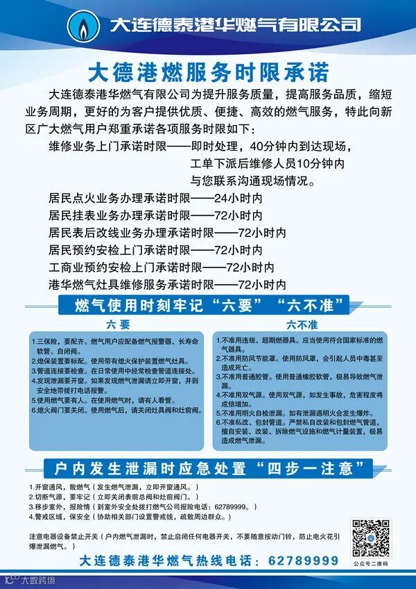 大连德泰港华燃气有限公司为提升服务质量,提高服务品质,缩短业务周期,更好的为客户提供优质、便捷、高效的燃气服务,特此向新区广大燃气用户郑重承诺各项服务时限如下:
