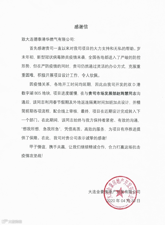 在正月“疫情”最严重期间,数字湖05地块项目单位急于完成燃气设计工作,赵筠慧积极主动配合项目单位,加班加点赶进度,在客户要求的时限内完成了燃气设计工作,最大程度满足了用户的需求,保证了项目的整体推进进度。为此用户近日送来了感谢信,对赵筠慧同志表示感谢,对燃气公司的高质量、高效率服务更是竖起了大拇指!
