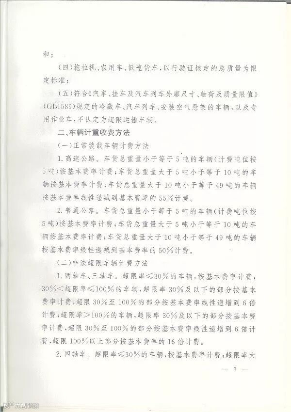 车货总重>55吨车辆:超限率30%及以下的部分按基本费率计费,超限30%至55吨的部分按上款基本费率线性递增到6倍模式计费,55吨以上部分按基本费率的16倍计费。