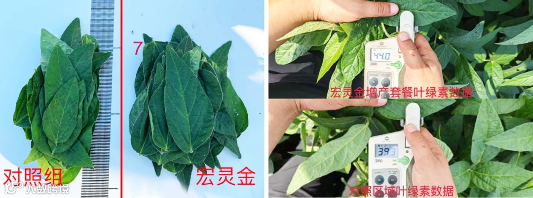 叶片面积增大、叶片变厚、叶绿素含量平均提高3-4个点,增加作物的光合面积和光合效率。