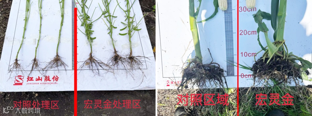 玉米表现为每株气生根较对照平均多8-10根,且毛细根更加发达;大豆主根侧根增粗,根瘤数量较对照平均每株数量显著增多,且更大更健康;增强作物吸收养分及固土能力。
