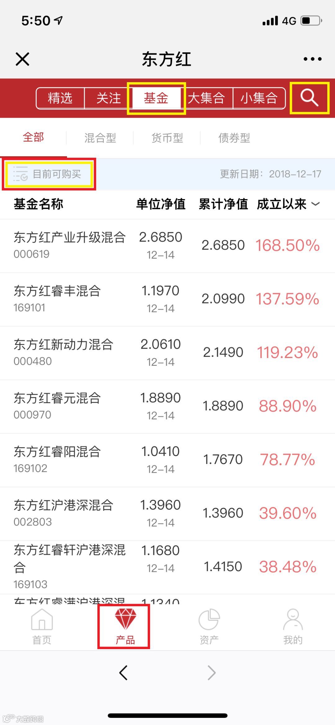 下方第二、三栏为“产品”和“资产”页面,在“产品”页面,我们新增了 “目前可购买”功能,点击“目前可购买”按钮您可以快速筛选当前开放可进行认申购的产品,您还可以在右上方输入关键字进行搜索哦。
