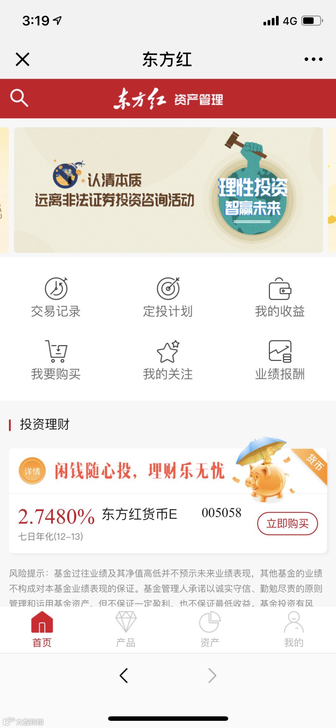 进入“首页”,您可以看到六大功能模块。点击“定投计划”您可以新增或管理您的基金定投计划。点击“业绩报酬”您可以查看您所持有的集合产品已计提的业绩报酬和未计提的业绩报酬预估。