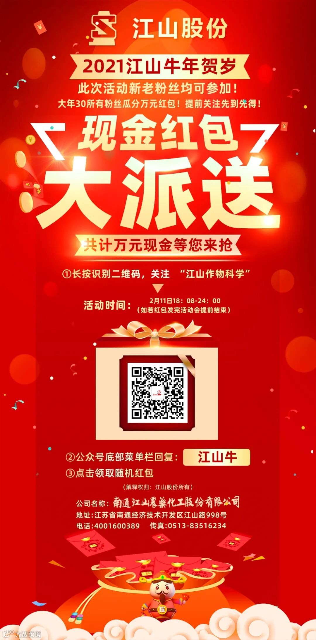 感谢一年来各位对“江山股份”的支持,对“江山作物科学”的关注。今天现在江山股份准备了万元礼金回馈各位。“江山作物科学”公众号后台回复:江山牛,即可领取随机新年红包一个(详情下滑查看领取方式)。祝大家新年快乐~也希望您能一直支持江山股份!谢谢大家~