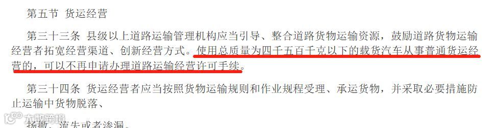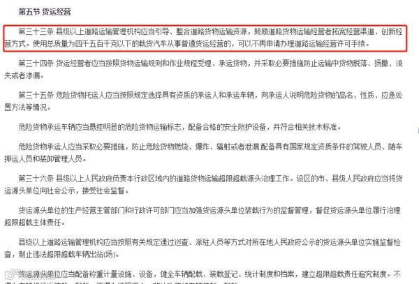 其中条例的第五节第三十三条明确规定:关于货运经营的部分明确表示县级以上道路运输管理机构应当引导、整合道路货物运输资源,鼓励道路货物运输经营者拓宽经营渠道、创新经营方式。