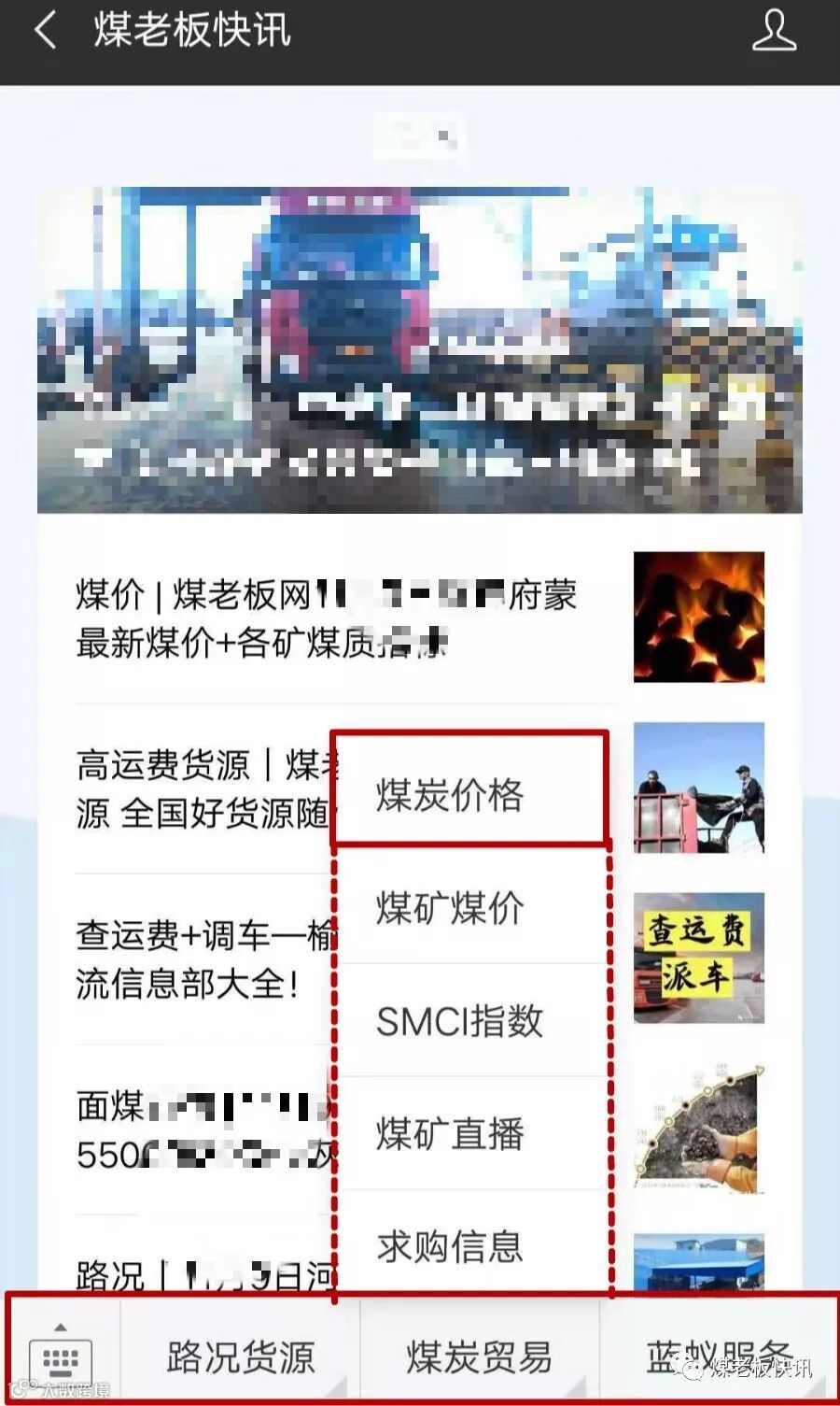2.进入微信公众号煤老板快讯,点击子菜单煤炭贸易,查看煤炭价格,即可查看各矿煤价、指标和联系方式