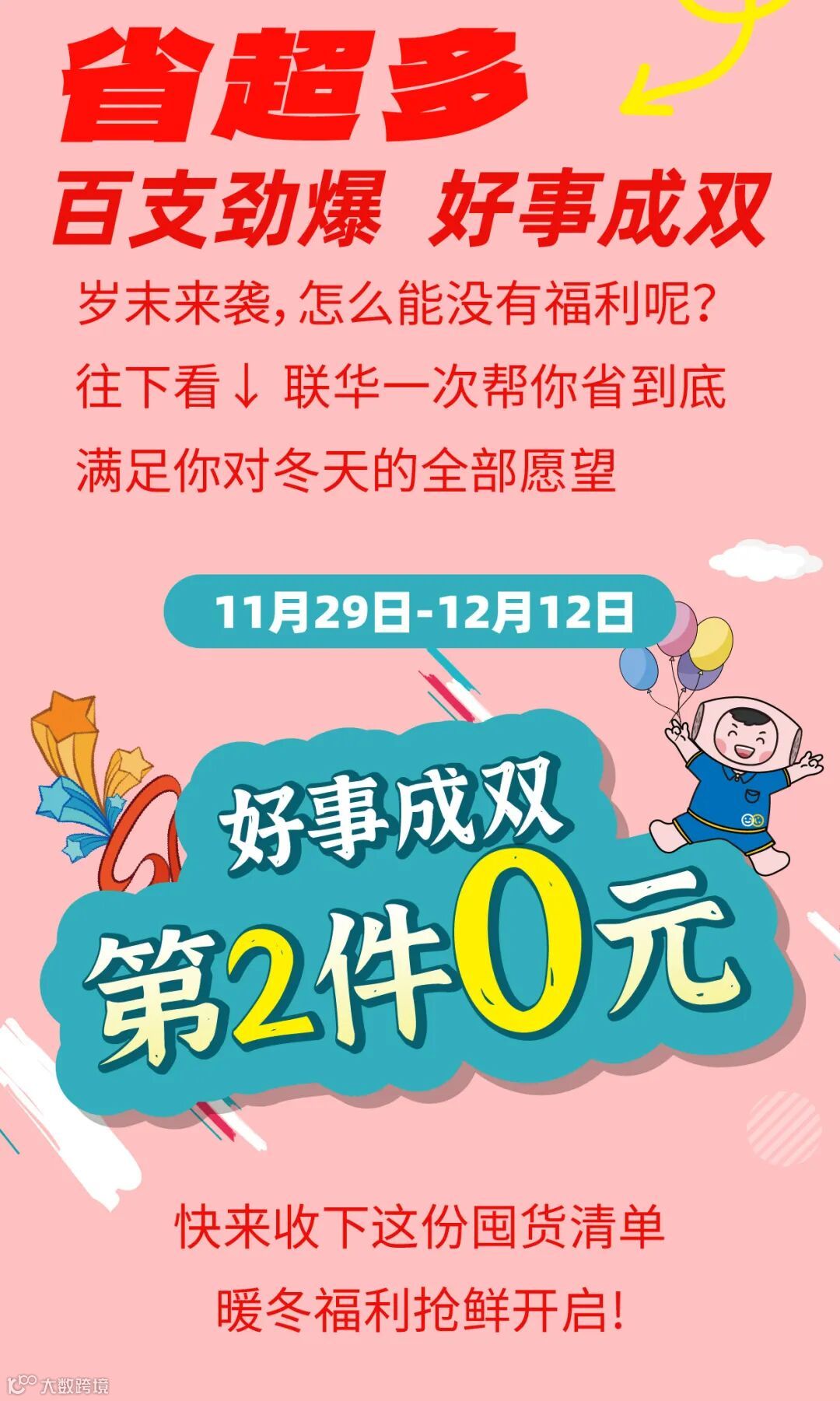 @所有人 第2件0元丨联华年终放大招→百支劲爆,好事成双!