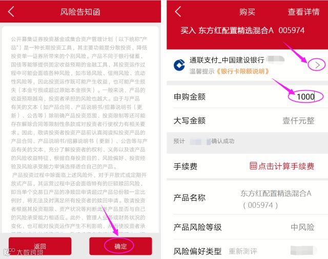 阅读“风险告知函”,选择银行卡,输入认购金额,查看适当性匹配意见,点击“下一步”