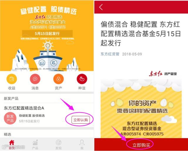 在首页新发产品处选择东方红配置精选混合基金,点击“立即认购”,了解产品信息,“立即购买”!