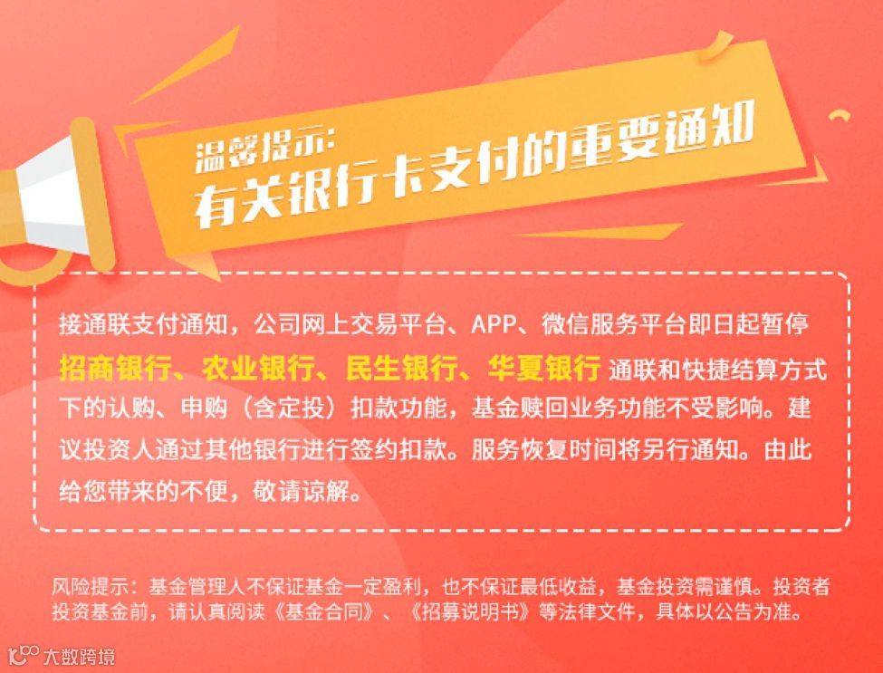 接通联支付通知,公司网上交易平台、APP、微信服务平台即日起暂停招商银行通联快捷结算方式下的认购、申购(含定期定额申购)扣款功能,开户、基金赎回业务功能不受影响。请使用招商银行的投资人做好相关安排。建议投资人通过其他银行进行签约扣款。服务恢复时间将另行通知。