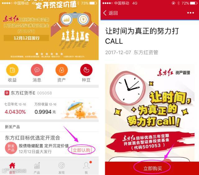 在首页新发产品处选择东方红目标优选,点击“立即认购”,了解产品信息,“立即购买”!