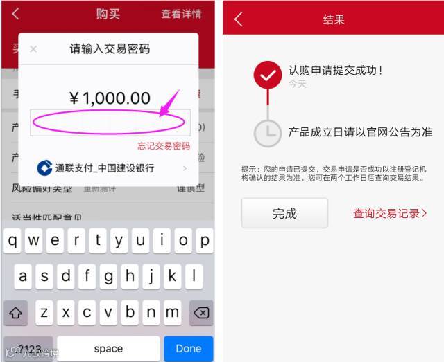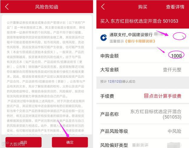 阅读“风险告知函”,输入认购金额,选择银行卡,查看适当性匹配意见,点击“下一步”
