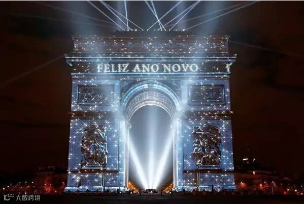 巴黎市政府在凯旋门举办跨年活动,平時车水马龙的香榭丽舍大道改为步行区,涌进一大波人潮,前来看一场凯旋门前的灯光秀。凯旋门的上空开始一场绚丽的灯光表演,在光影的交织中步入新的一年。