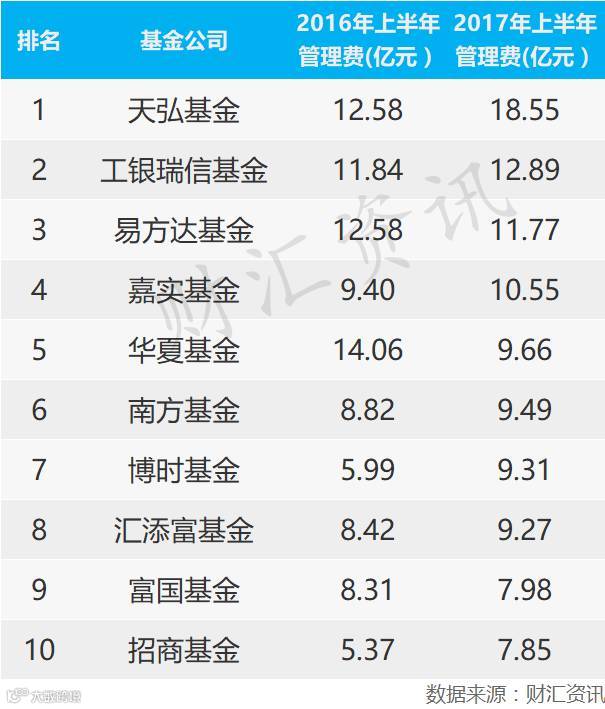 2017年上半年公募基金共计提管理费约262.55亿元,较2016年上半年增加约26.61亿元,同比增长11,28%。天弘基金凭借着超万亿的资产规模收取的管理费也多达18.55亿元。