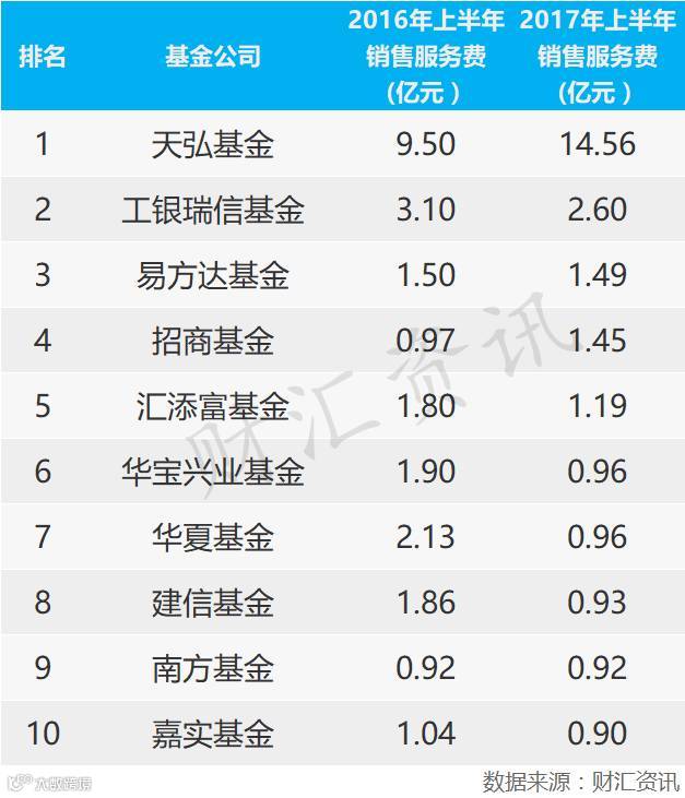 2017年上半年共募基金共收取销售服务费约35.85亿元,较2016年上半年增加约0.13亿元,同比增长0.36%。其中天弘余额宝货币一只基金收取的销售服务费就多达14.11亿元,超过榜单中剩余9家收取的销售服务费总和。