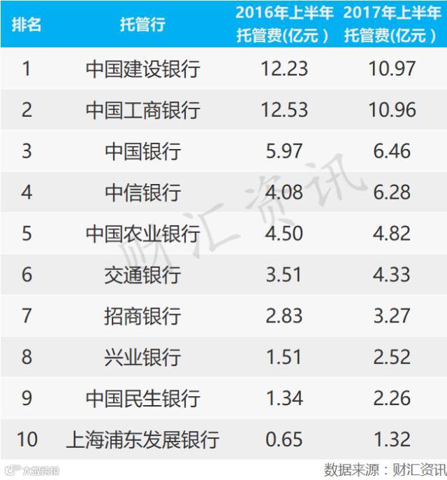 从托管行收取的托管费统计来看,中国建设银行上半年共收取10.97亿元,和去年同期相比,超过中国工商银行成为榜首。