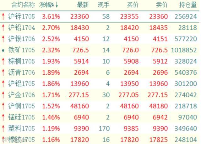 有色金属期货收盘领涨,沪锌主力收涨3.6%。截至收盘,沪铅、沪银、铁矿涨超2%,棕榈、沥青、沪铝、沪金、沪铜、锰硅、塑料、橡胶、沪锡涨超1%,沪镍、焦炭、菜粕、郑棉、豆粕收涨。