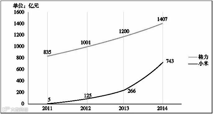 雷军为什么敢打这个赌?请看图 7-1,2011—2014 年小米和格力的营业额对比。在 2011 年,格力的销售额是 835 亿元,小米是 5 亿元,完全不是一个数量级的。而到了 2014 年,格力的销售额是 1407 亿元,小米的销售额已经是格力的一半还多,达 743 亿元。2014 年 12 月 13 日,雷军在中国企业领袖年会上预测,2015 年小米营业额将超过 1000 亿元。如果双方都延续这个增长趋势,似乎小米在几年后很有可能追上格力。
