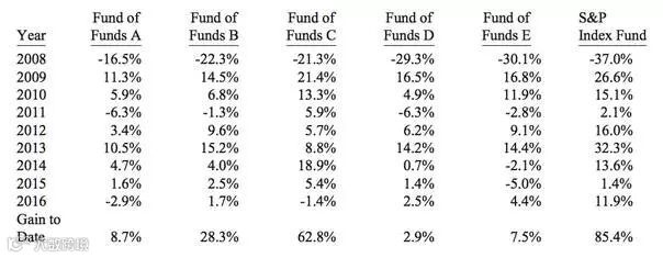 事实是,我们处于一个“中性”的环境中。在这样一个环境中,五支基金到2016年年底的按年复利计算的平均收益率仅仅为2.2%,也就是说在这五支基金中各投资100万美元到现在你会获得22万美元的利润。而指数基金的收益会高达85.4万美元。