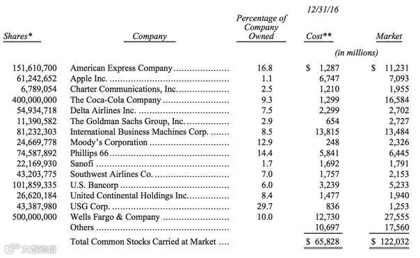 2. 这是伯克希尔·哈撒韦公司实际购买股票的成本价,也是公司计算资本所得税的根据。在一些情况下,符合一般通用会计标准的成本与实际成本不相同,这是因为根据一般通用会计标准的规定,公司对一些股票进行资产减值计提处理。