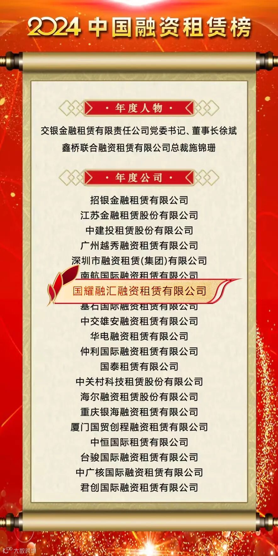 此次已是国耀融汇租赁连续第六年获得“中国融资租赁年度公司”称号,是行业对国耀融汇租赁在过去一年多元化的业务布局和综合金融实力及在金融支持、风险管理、业务创新等方面的专业能力的充分肯定,更是对公司持续稳健发展和服务实体经济质效取得显著成就的高度认可。