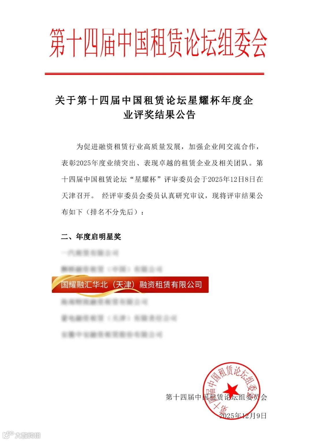 近日,第十四届中国租赁年会“星耀杯”评选公布,国耀融汇租赁华北子公司——国耀融汇华北(天津)融资租赁有限公司(以下简称“华北公司”)凭借深化普惠金融的突出优势及稳健合规经营荣获”2025年度启明星奖”。