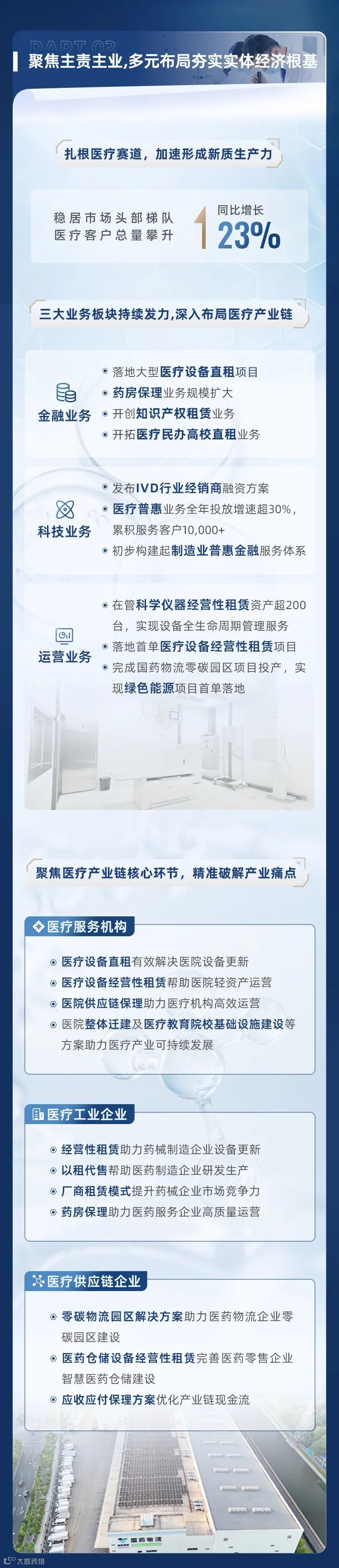 国耀融汇依托股东强大的产业背景与资源,聚焦医疗大健康产业发展,深耕医疗服务、医疗工业、普惠业务、健康环保和民生健康等产业板块,并不断延伸服务边界,打造了医疗上下游全产业链的生态服务版图,为医疗大健康产业领域内各类医疗机构及企业客户提供多元化产品与一站式服务。