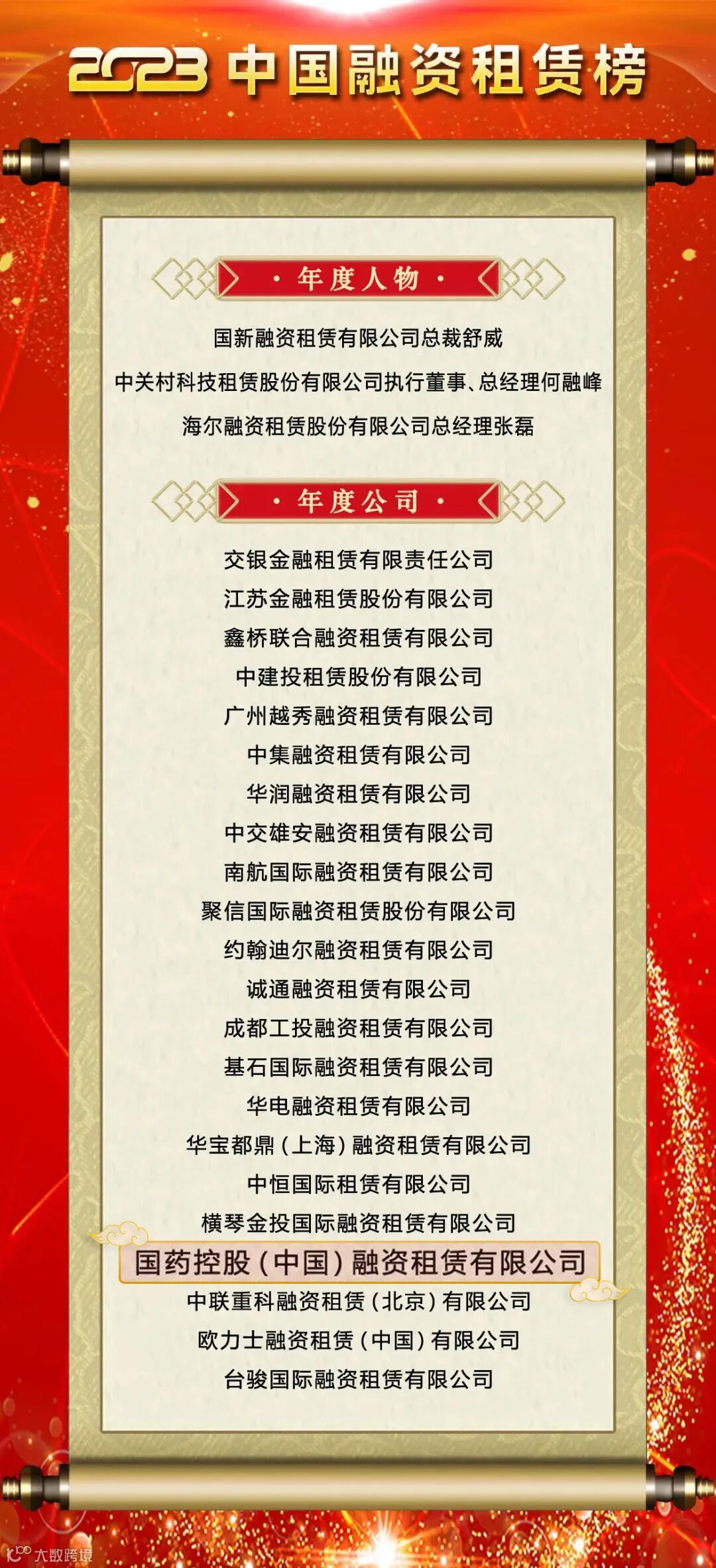 11月29日,中国外商投资企业协会租赁业工作委员会发布了“2023中国融资租赁榜”。经过业内专家、学者的一致审定,国控租赁凭借过去一年在服务实体经济与稳健经营方面的杰出表现,获评“2023中国融资租赁年度公司”。