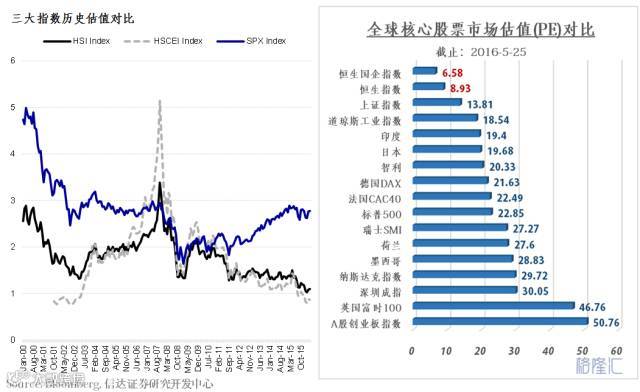 恒生国企指数和恒生指数的估值水平,如果横向来看,是全世界全市场最低的估值。而就在半年前,国企指数的PB,还是现在的4-5倍,经过短短的半年,整个市场的估值水平可以发生如此之大的变化,也是非常不合理的。香港市场确实下跌了,跌的是有些多,但是这样的低估值,也绝对是难得一见,而这样低估值的长期维持,则更是不合理的。