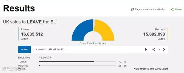 当地时间6月24日6时,英国公投脱欧阵营赢得超过1680万张选票,奠定最后胜利,英国公投选择脱离欧盟。截至6时,全部328个选区仅剩下8个选区进行最后的计票,但脱欧阵营已经赢得超过半数的1680万选票,超留欧阵营120万选票,已经赢得公投胜利,英国公投最后结果为脱离欧盟。