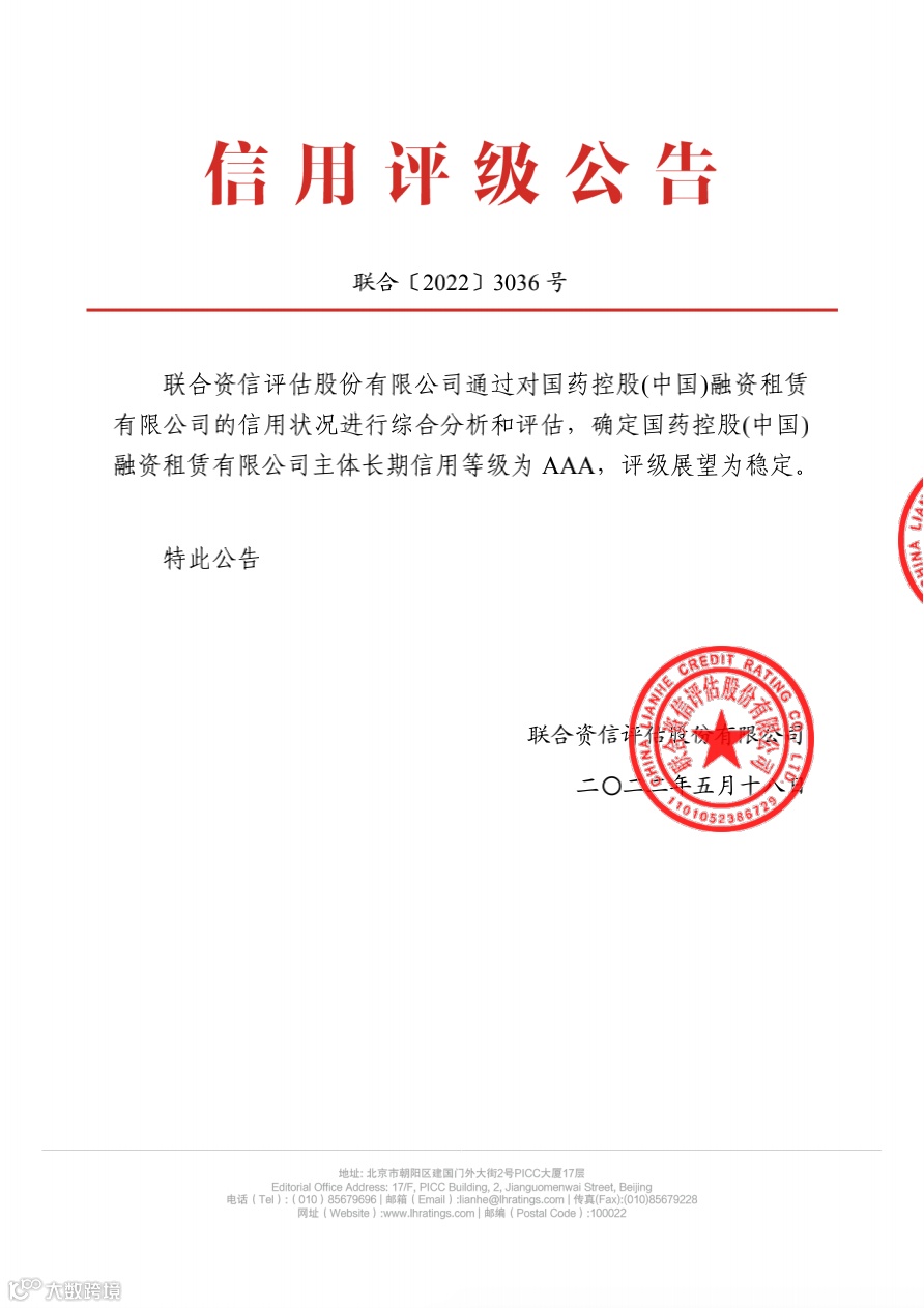 近日,联合资信评估有限公司(以下简称“联合资信”)发布信用评级报告,确定国药控股(中国)融资租赁有限公司(以下简称“国控租赁”)主体长期信用等级为AAA,评级展望为稳定。