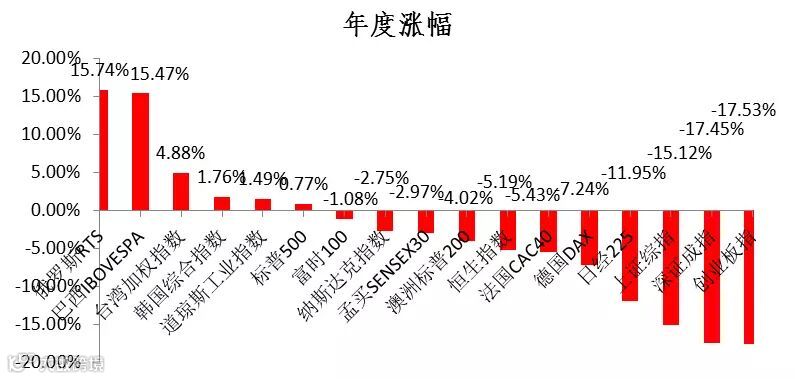 从主要国家的股市表现来看,整体依旧是震荡下跌的格局,美国略好于其他欧美国家和日本,新兴市场分化较为明显,巴西跟俄罗斯受益于大宗商品反弹,资本市场出现反弹。