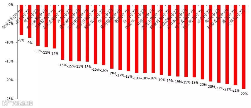 据申万一级行业统计显示,2016年一季度所有行业都出现了大幅的下跌,其中食品饮料(-8%)银行(-9%)采掘(-11%)有色金属(-11%)跌幅相对较小,计算机(-22%)通信(-21%)机械设备(-21%)传媒(-21%)跌幅相对较大。